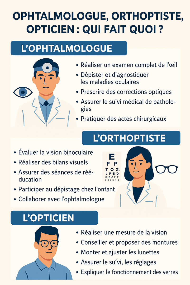 Ces trois métiers forment une chaîne cohérente au service de votre santé visuelle :